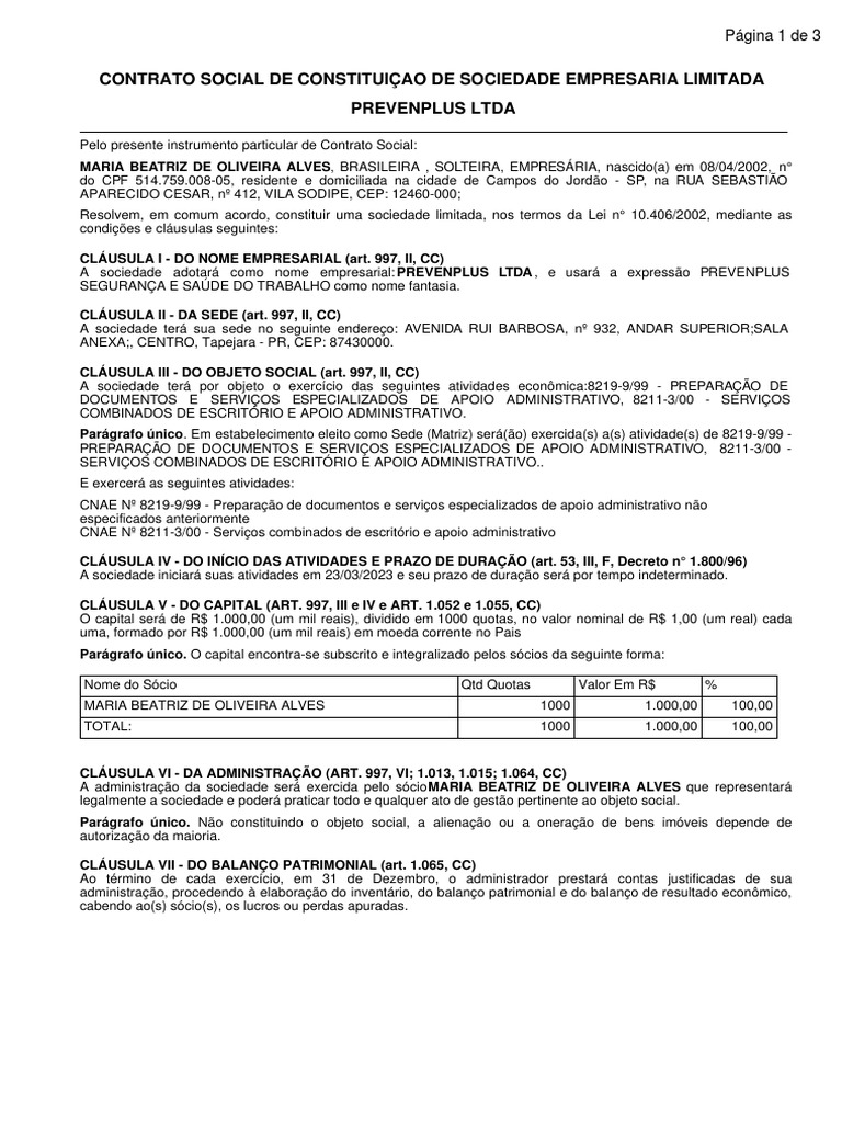 A sociedade adotará como nome empresarial: PREVENPLUS LTDA , e usará a expressão PREVENPLUS