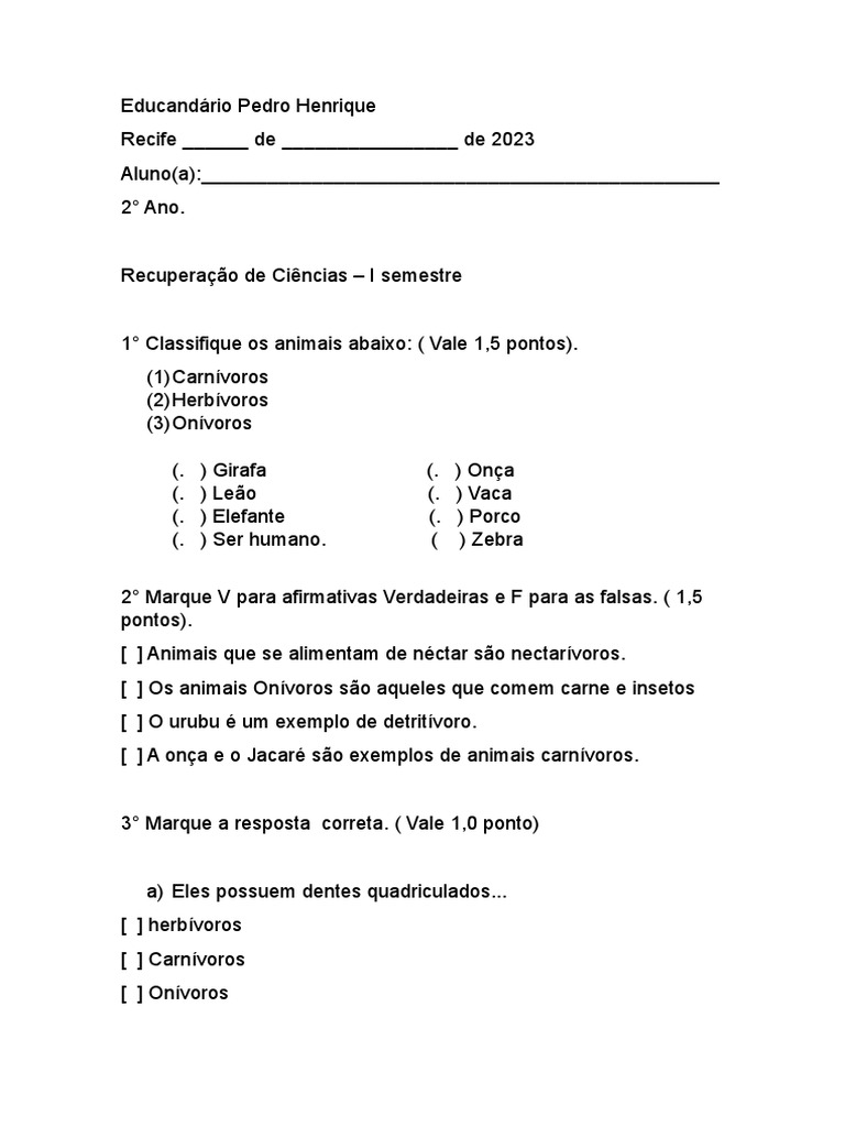 [ ] A onça e o Jacaré são exemplos de animais carnívoros.