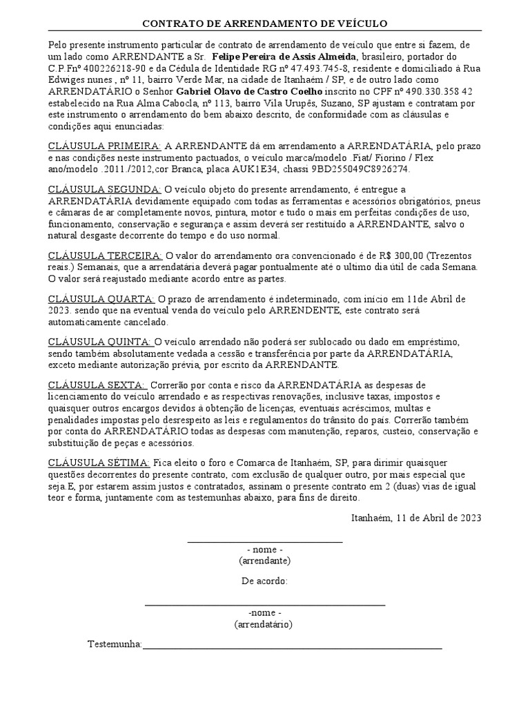 Pelo presente instrumento particular de contrato de arrendamento de veículo que entre si fazem, de