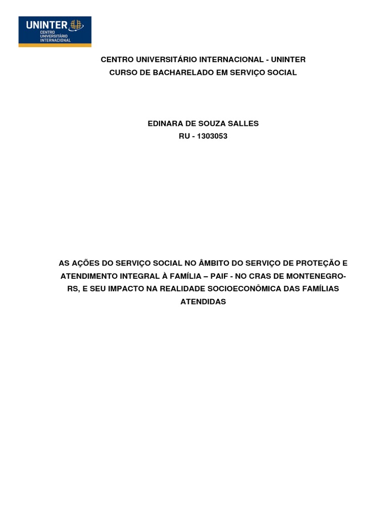 Serviço Social do Centro Universitário Internacional UNINTER / Curitiba-PR, como