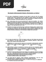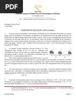 permanece em contato com o cho durante um intervalo de 0,01 s. (a) Calcule o valor desta acelerao mdia. 08) Um carro sobe um morro na velocidade constante de 40 km/h, e volta, descendo, a 60 km/h. Calcule a velocidade escalar mdia de todo o percurso. 09) Uma pessoa v um vaso de flores passar em frente a uma janela de 2,0 m de altura, primeiro para cima e depois para baixo. Se o tempo total em que o vaso permanece visvel 0,5 s, determine a altura que ele atinge, acima da janela. 10) Um balo sobe com velocidade de 15 m/s e est a 100 m de altura em relao ao solo quando dele se deixa cair um pacote. Quanto tempo decorrer at que o pacote atinja o solo? 11) Uma pedra largada de uma ponte, situada a 50 m acima do nvel da gua. Uma outra pedra lanada verticalmente para baixo 1,5 s aps a sada da primeira. Ambas atingem a gua no mesmo tempo. Qual foi a velocidade inicial da segunda pedra? 12) Deixa-se cair uma pedra num poo profundo. O barulho da queda ouvido 2 s depois. Sabendo que a velocidade do som no ar de 300 m/s, calcule a profundidade do poo. 13) Um corpo lanado verticalmente para cima com velocidade 40 m/s. No mesmo instante, do ponto mais alto que o primeiro pode alcanar, lana-se com a mesma velocidade inicial, um segundo corpo verticalmente para baixo. Depois de quanto tempo os dois corpos se encontraro? A que altura acima do ponto do primeiro lanamento ir ocorrer o choque? Qual a velocidade de cada corpo no momento do choque? 14) Gotas de gua caem de um chuveiro sobre o piso, situado a 2,0 m abaixo. As gotas caem em intervalos regulares e quando a primeira atinge o cho a quinta gota est comeando a cair. Determine as posies da segunda e da terceira gotas em relao ao chuveiro, no instante em que a primeira bate no cho: 15) Um elevador sobe com uma acelerao, para cima, de 2 m/s2. No instante em que sua velocidade de 4,0 m/s, um parafuso solto cai do teto do elevador, que est a 2,5 m do seu piso. Calcule: (a) o tempo que o parafuso gasta para atingir o piso; (b) seu deslocamento em relao ao poo do elevador. 16) Dois trens, cada um com uma velocidade de 30 km/h, esto se dirigindo um ao encontro do outro no mesmo trilho reto. Um pssaro que consegue voar a 60 km/h parte voando da frente de um trem quando eles esto afastados a 60 km e se dirige diretamente para o outro trem. Quando alcana o outro trem ele voa diretamente de volta para o primeiro trem, e assim por diante. Qual a distncia total percorrida pelo pssaro? 17) Uma pedra lanada de um rochedo que tem 200 m de altura. Durante o ltimo meio segundo de queda ele percorre a distncia de 45 m. Calcule a velocidade inicial da pedra.