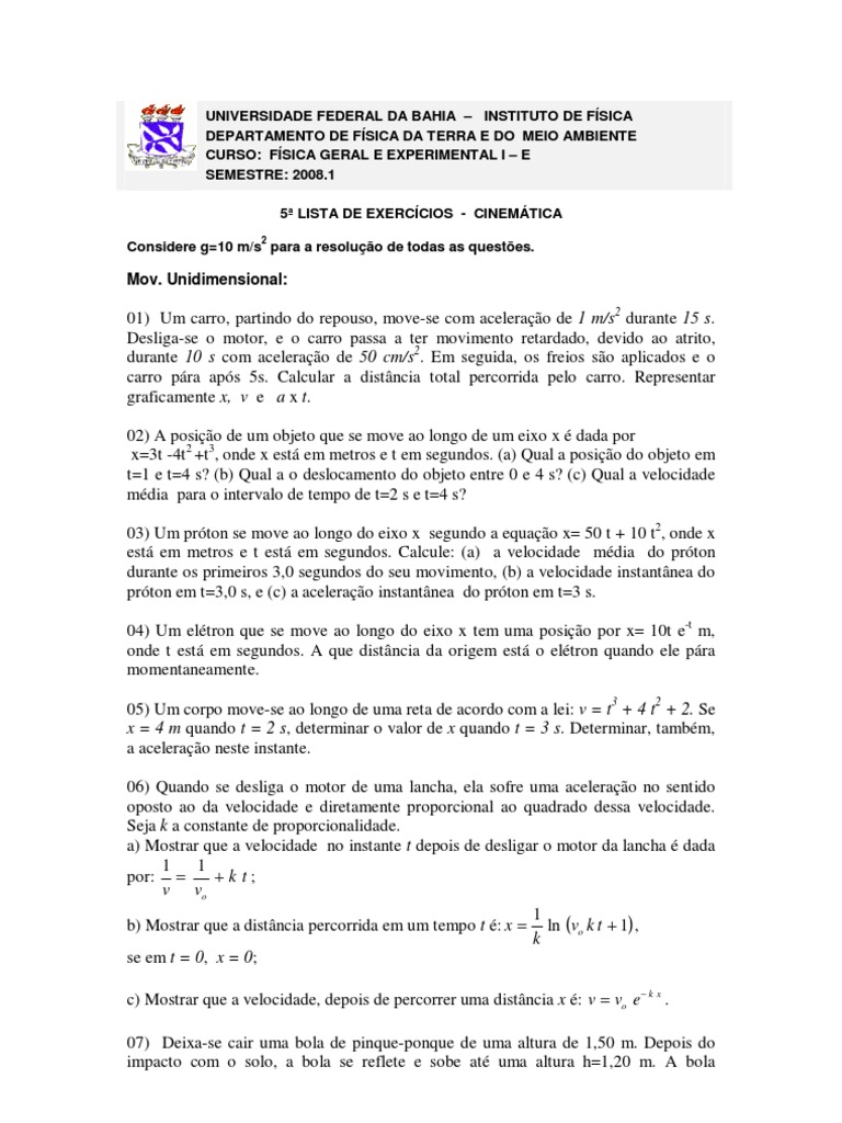 E: 2008.1 5 LISTA DE EXERCCIOS - CINEMTICA Considere g=10 m/s2 para a resoluo de todas as questes.