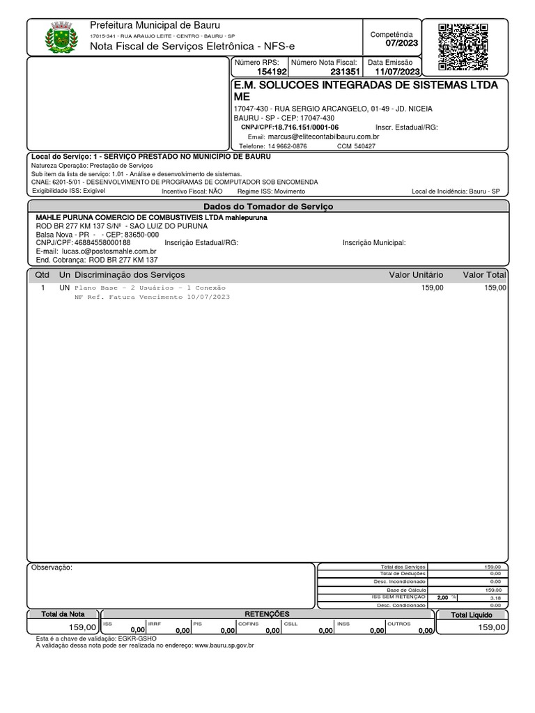 Observação: Total dos Serviços 159,00