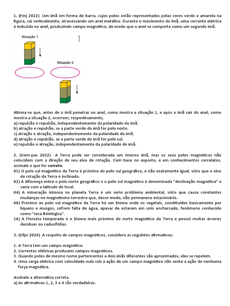 2. (Uem-pas 2022) A Terra pode ser considerada um imenso ímã, mas os seus polos magnéticos não