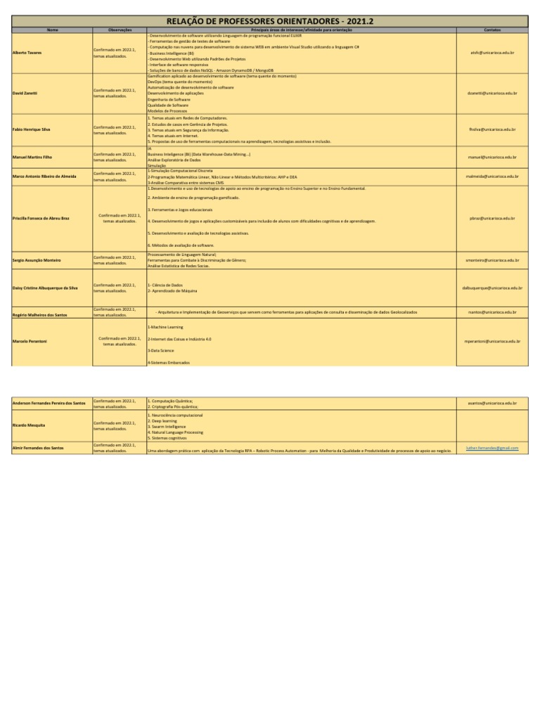Nome Observações Principais áreas de interesse/afinidade para orientação Contatos