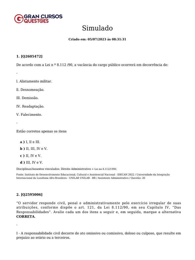 Disciplinas/Assuntos vinculados: Direito Administrativo > Legislação Administrativa, Lei no 8.112/1990.