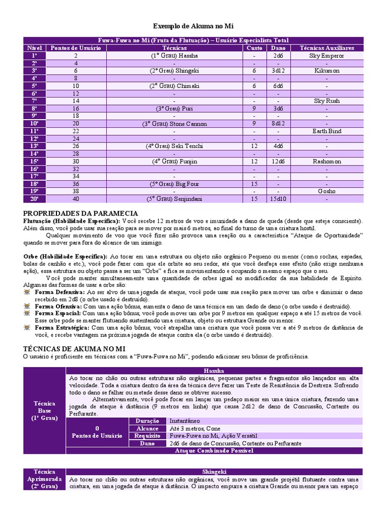O usuário é proficiente em técnicas com a “Fuwa-Fuwa no Mi”, podendo adicionar seu bônus de proficiência.