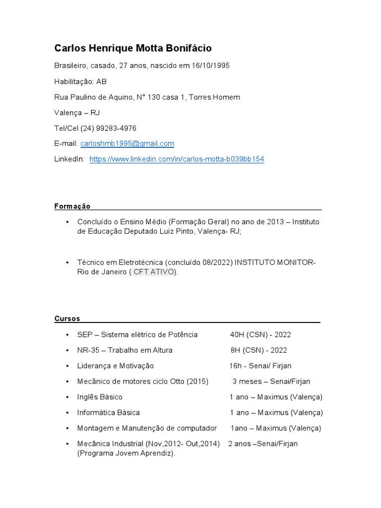 Brasileiro, casado, 27 anos, nascido em 16/10/1995