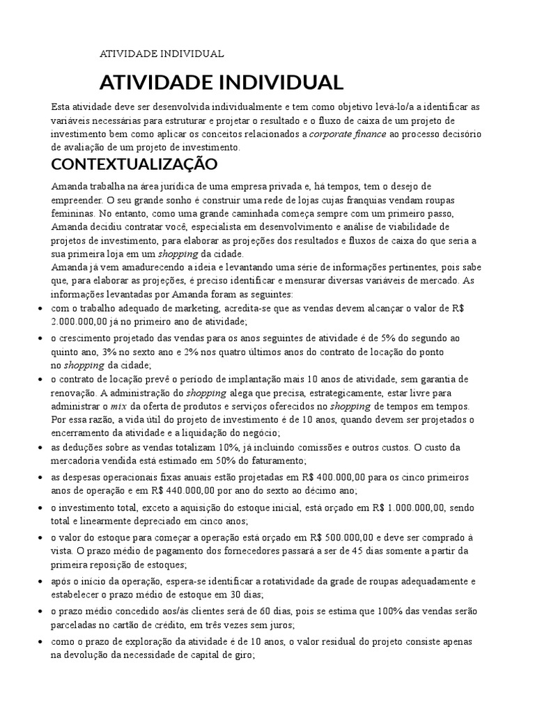 investimento bem como aplicar os conceitos relacionados a corporate finance ao processo decisório