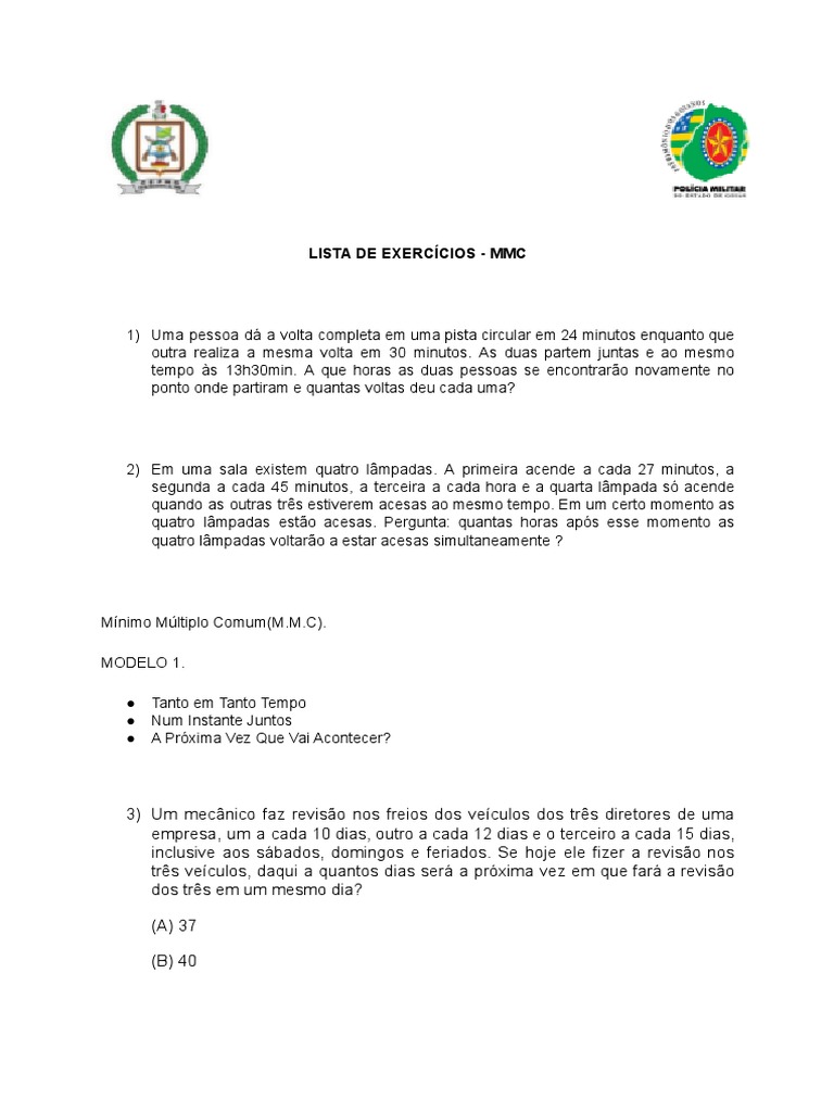 2) Em uma sala existem quatro lâmpadas. A primeira acende a cada 27 minutos, a
