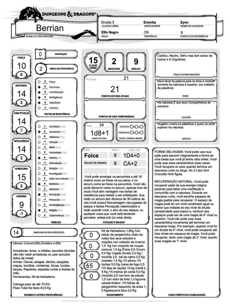 NOME DO PERSONAGEM RAÇA TENDÊNCIA PONTOS DE EXPERIÊNCIA