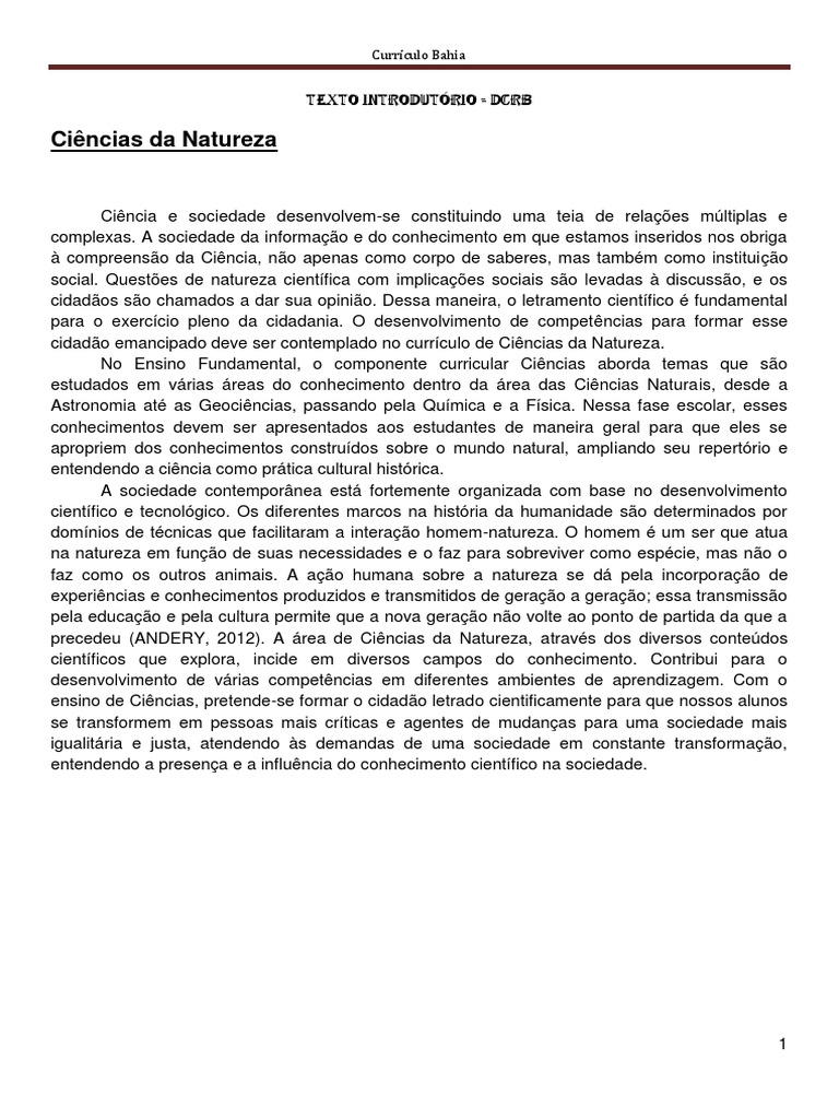 sociedade (BARRETO, 2016). O objetivo do currículo baiano é integrar e não afastar o ser