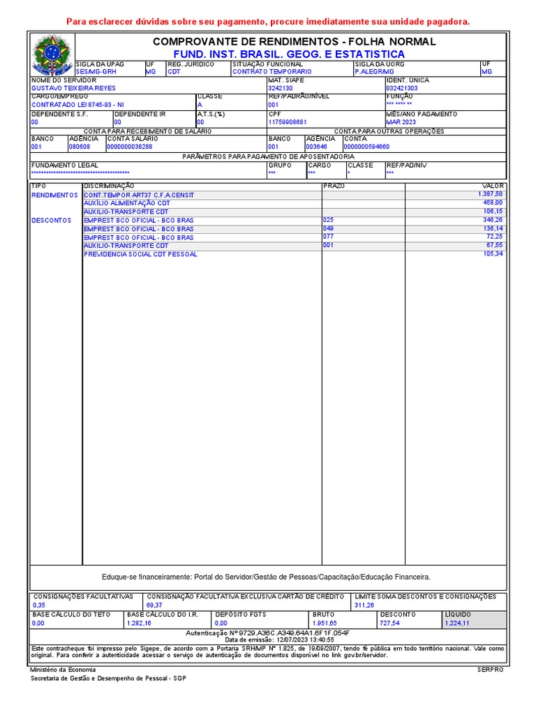 Este contracheque foi impresso pelo Sigepe, de acordo com a Portaria SRH/MP Nº 1.825, de 19/09/2007, tendo fé pública em todo território nacional. Vale como