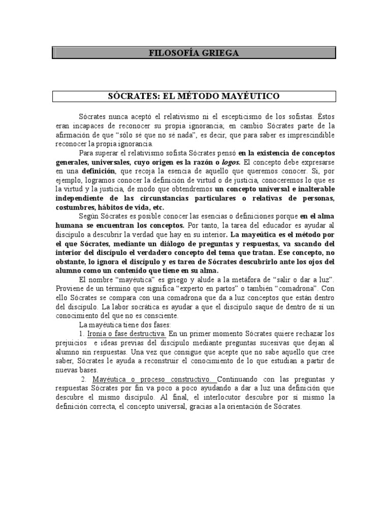 Scrates nunca acept el relativismo ni el escepticismo de los sofistas. stos eran incapaces de reconocer su propia ignorancia; en cambio Scrates parte de la afirmacin de que slo s que no s nada, es decir, que para saber es imprescindible reconocer la propia ignorancia. Para superar el relativismo sofista Scrates pens en la existencia de conceptos generales, universales, cuyo origen es la razn o logos. El concepto debe expresarse en una definicin, que recoja la esencia de aquello que queremos conocer. Si, por ejemplo, logramos conocer la definicin de virtud o de justicia, conoceremos lo que es la virtud y la justicia, de modo que obtendremos un concepto universal e inalterable independiente de las circunstancias particulares o relativas de personas, costumbres, hbitos de vida, etc. Segn Scrates es posible conocer las esencias o definiciones porque en el alma humana se encuentran los conceptos. Por tanto, la tarea del educador es ayudar al discpulo a descubrir la verdad que hay en su interior. La mayetica es el mtodo por el que Scrates, mediante un dilogo de preguntas y respuestas, va sacando del interior del discpulo el verdadero concepto del tema que tratan. Ese concepto, no obstante, lo ignora el discpulo y es tarea de Scrates descubrirlo ante los ojos del alumno como un contenido que tiene en su alma. El nombre mayutica es griego y alude a la metfora de salir o dar a luz. Proviene de un trmino que significa experto en partos o tambin comadrona. Con ello Scrates se compara con una comadrona que da a luz conceptos que estn dentro del discpulo. La labor socrtica es ayudar a que el discpulo saque de dentro de s un conocimiento del que no es consciente. La mayutica tiene dos fases: 1. Irona o fase destructiva. En un primer momento Scrates quiere rechazar los prejuicios e ideas previas del discpulo mediante preguntas sucesivas que dejan al alumno sin respuestas. Una vez que consigue que acepte que no sabe aquello que cree saber, Scrates le ayuda a reconstruir el conocimiento de lo que estudian a partir de nuevas bases. 2. Mayutica o proceso constructivo. Continuando con las preguntas y respuestas Scrates por fin va poco a poco ayudando a dar a luz una definicin que descubre el mismo discpulo. Al final, el interlocutor descubre por s mismo la definicin correcta, el concepto universal, gracias a la orientacin de Scrates.