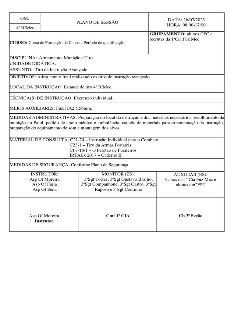16. Ao final de cada sessão de tiro os militares serão notificados e terão 2 minutos