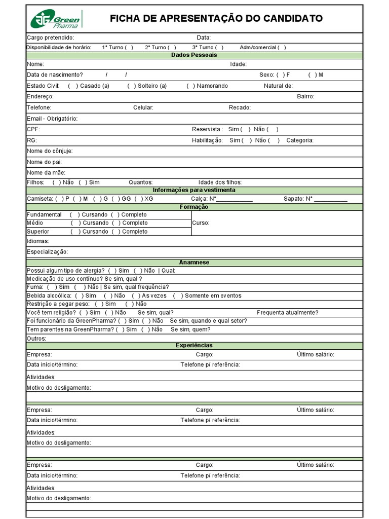 Tem parentes na GreenPharma? ( ) Sim ( ) Não Se sim, quem?