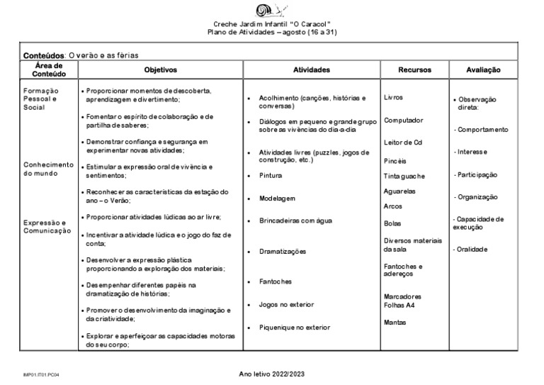 Objetivos Atividades Recursos Avaliação
