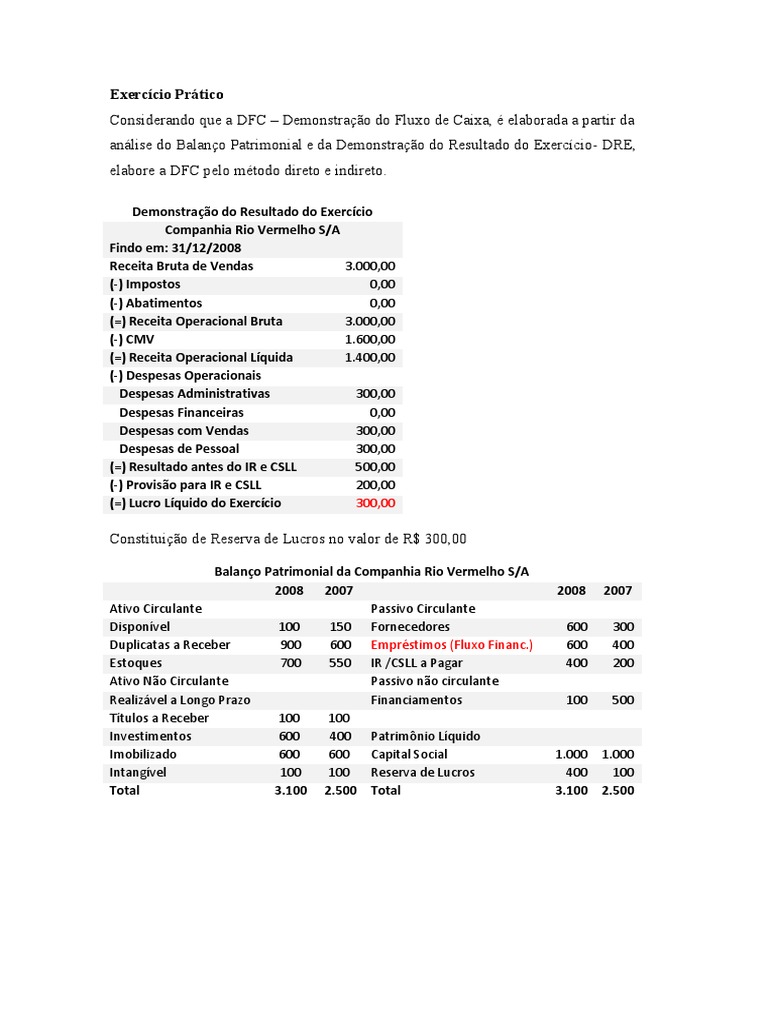 Demonstração de Fluxo de Caixa Empresa Vale do Rio Vermelho S/A em 31/12/2008