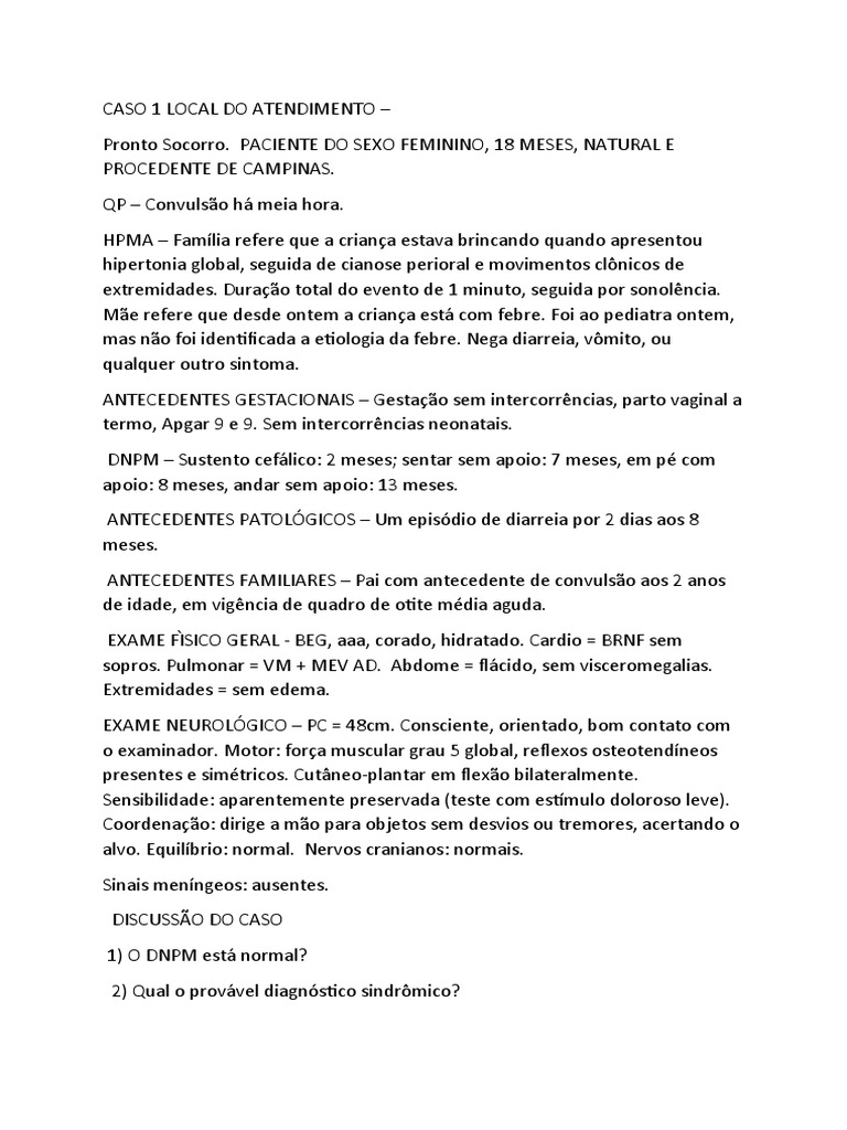 teve crises convulsivas. Evoluiu com atraso do desenvolvimento motor.