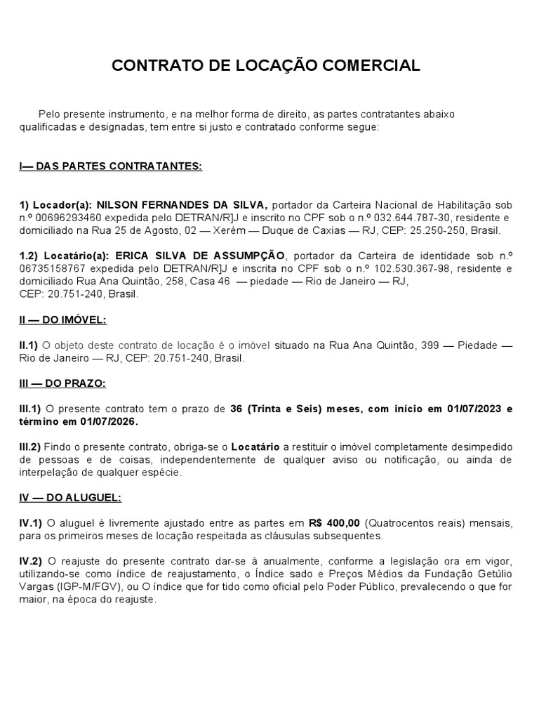 1) Locador(a): NILSON FERNANDES DA SILVA, portador da Carteira Nacional de Habilitação sob