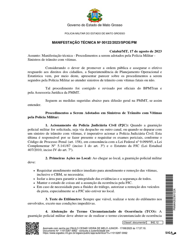 Assunto: Manifestação técnica - Procedimentos a serem adotados pela Polícia Militar -