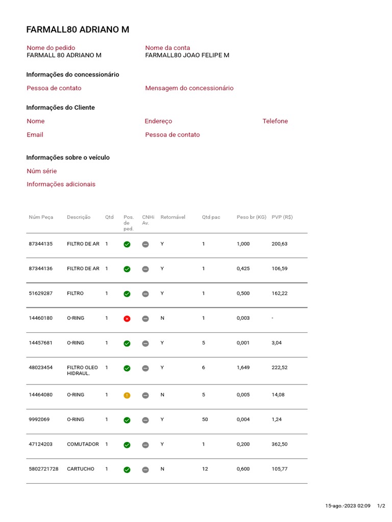 Núm Peça Descrição Qtd Pos. CNHi Retornável Qtd pac Peso br (KG) PVP (R$)