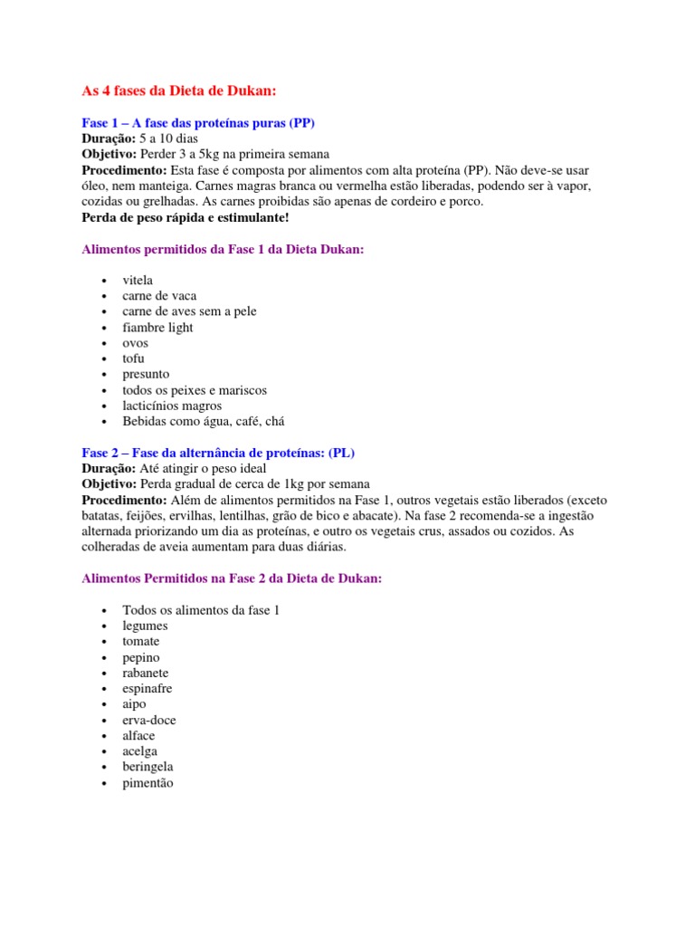 Fase 1 A fase das protenas puras (PP) Durao: 5 a 10 dias Objetivo: Perder 3 a 5kg na primeira semana Procedimento: Esta fase composta por alimentos com alta protena (PP). No deve-se usar leo, nem manteiga. Carnes magras branca ou vermelha esto liberadas, podendo ser vapor, cozidas ou grelhadas. As carnes proibidas so apenas de cordeiro e porco. Perda de peso rpida e estimulante! Alimentos permitidos da Fase 1 da Dieta Dukan: