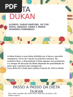 Fase 3 Transio e Consolidao do peso Durao: Vai depender do quanto se emagreceu com a dieta. Cada quilo perdido nas duas fases anteriores corresponde dez dias de alimentao seguindo esse terceiro cardpio. Por exemplo, se nas fases 1 e 2 voc perdeu 5 kg, a terceira fase tem que durar obrigatoriamente 50 dias. Objetivo: Manter o peso conquistado Procedimento: Esta fase introduz novos alimentos com moderao e duas refeies livres por semana que devem ser feitas em dias alternados e com moderao. Duas colheres de aveia diria deve ser mantida nessa fase. Entre o que deve ser evitado, temos: cerejas, banana, frutas secas. Alimentos permitidos na Fase 3 da Dieta Dukan