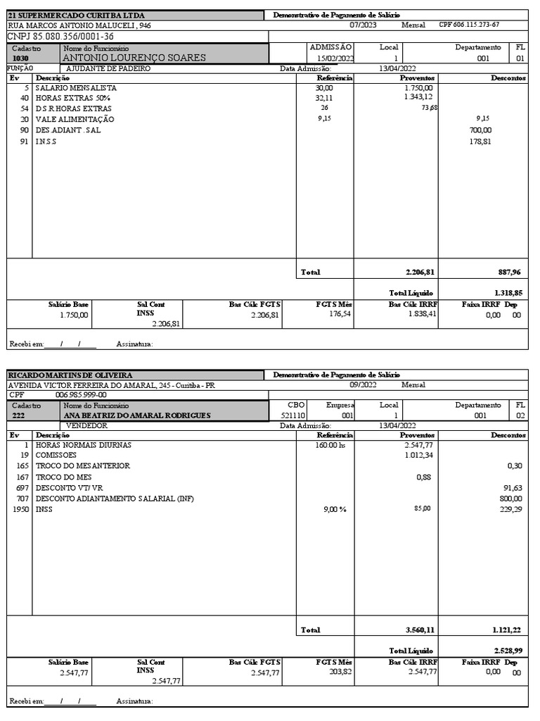 21 SUPERMERCADO CURITBA LTDA Demonstrativo de Pagamento de Salário