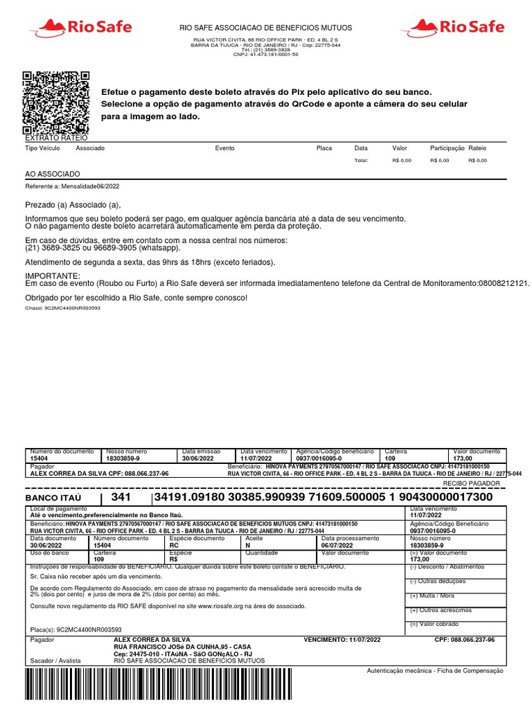 Beneficiário: HINOVA PAYMENTS 27970567000147 / RIO SAFE ASSOCIACAO DE BENEFICIOS MUTUOS CNPJ: 41473181000150 Agência/Código Beneficiário