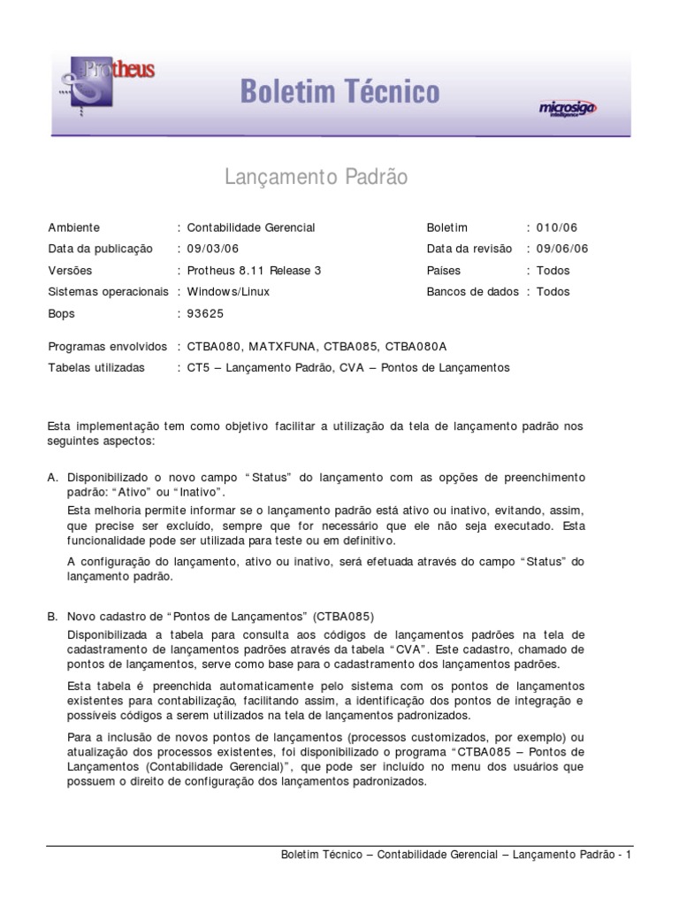 Boletim Técnico – Contabilidade Gerencial – Lançamento Padrão - 1