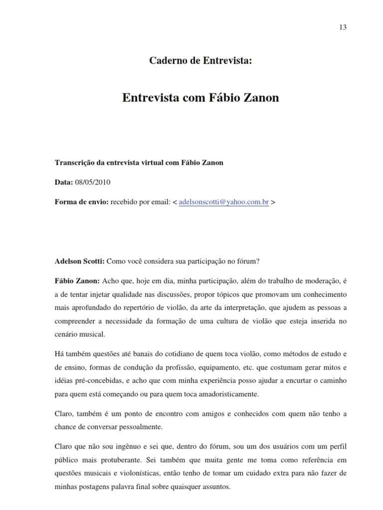 Fábio Zanon: Acho que, hoje em dia, minha participação, além do trabalho de moderação, é a de tentar injetar qualidade nas discussões, propor tópicos que promovam um conhecimento mais aprofundado do repertório de violão, da arte da interpretação, que ajudem as pessoas a compreender a necessidade da formação de uma cultura de violão que esteja inserida no cenário musical.