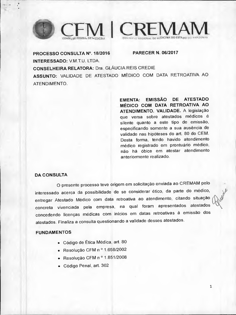 CFM ou do CREMAM, o médico pode emitir atestado com data retroativa, desde que