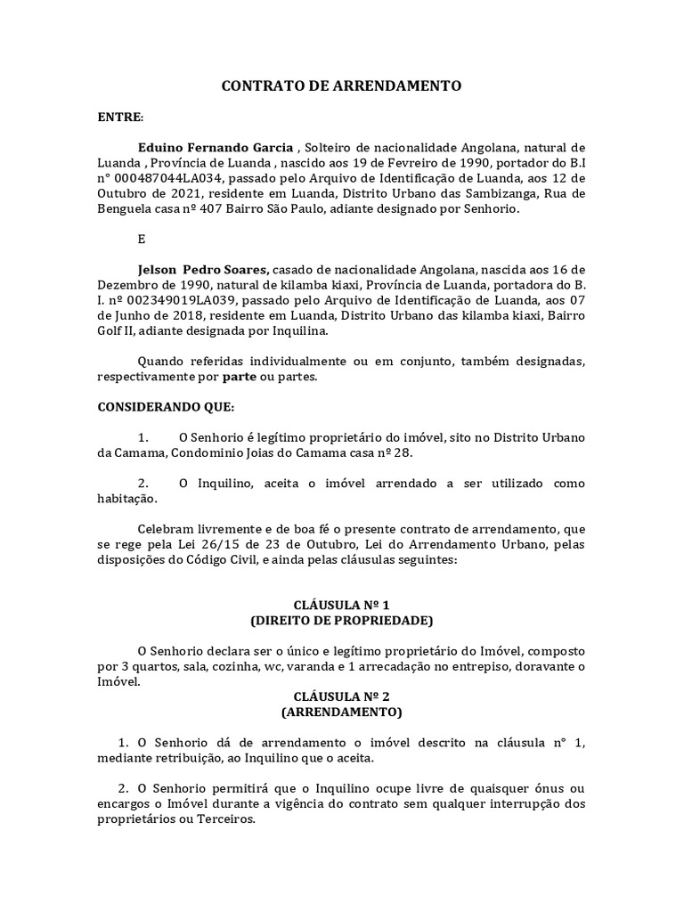 Benguela casa nº 407 Bairro São Paulo, adiante designado por Senhorio.