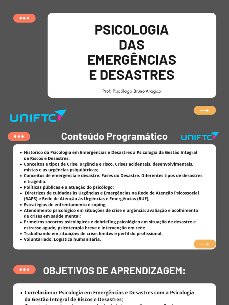 seguinte ao desastre, por meio do primeiro auxilio psicológico. Com abordagem focal