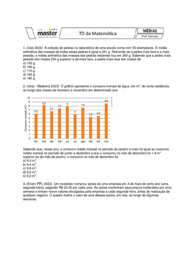 2. (Unip - Medicina 2023) O gráfico apresenta o consumo mensal de água, em m3, de certa residência