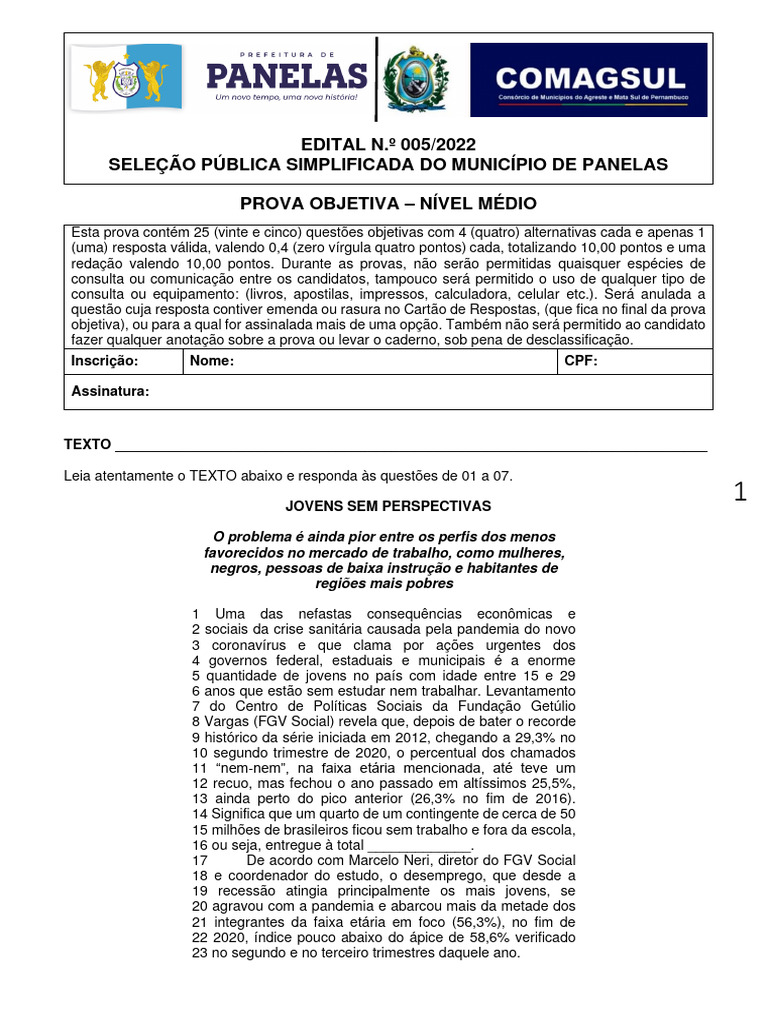 SELEÇÃO PÚBLICA SIMPLIFICADA DO MUNICÍPIO DE PANELAS