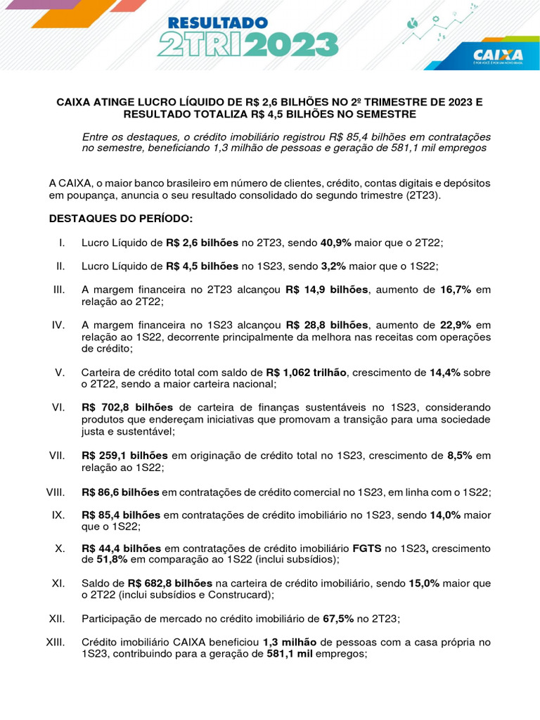 CAIXA ATINGE LUCRO LÍQUIDO DE R$ 2,6 BILHÕES NO 2º TRIMESTRE DE 2023 E