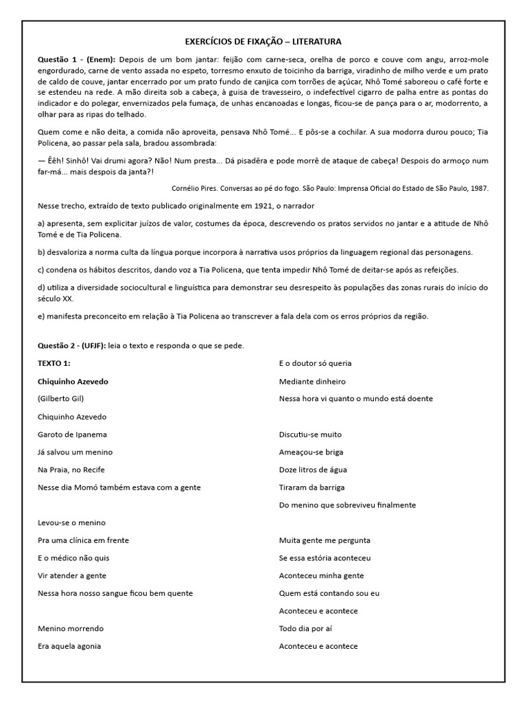 Questão 1 - (Enem): Depois de um bom jantar: feijão com carne-seca, orelha de porco e couve com angu, arroz-mole