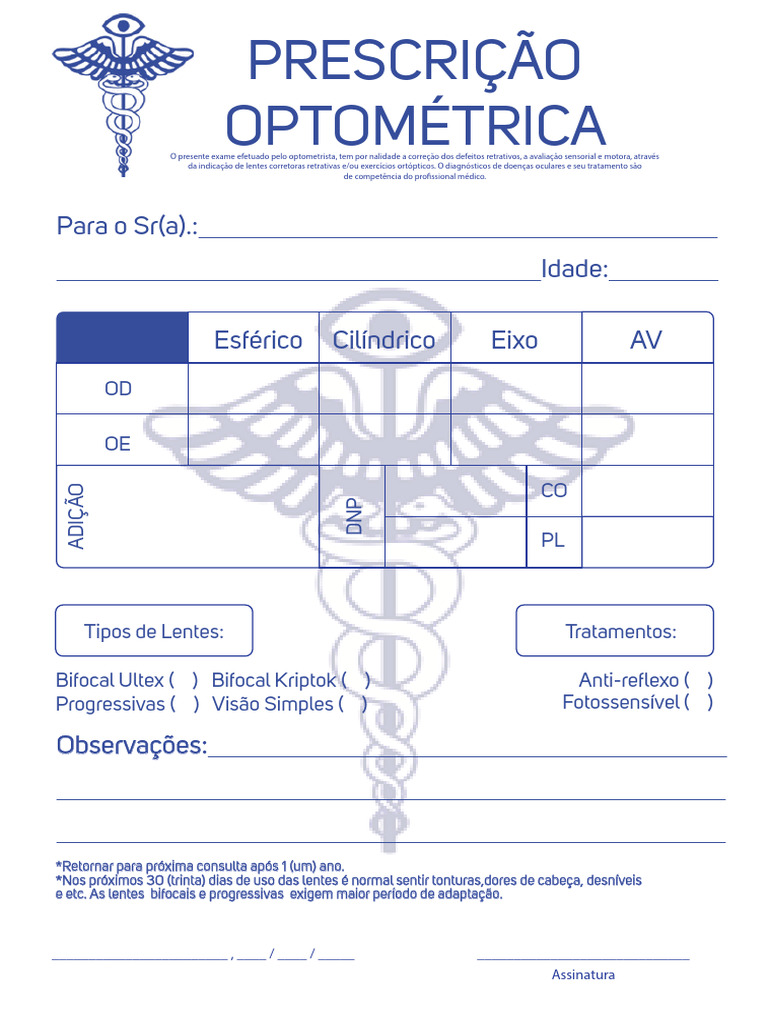 O presente exame efetuado pelo optometrista, tem por nalidade a correção dos defeitos retrativos, a avaliação sensorial e motora, através