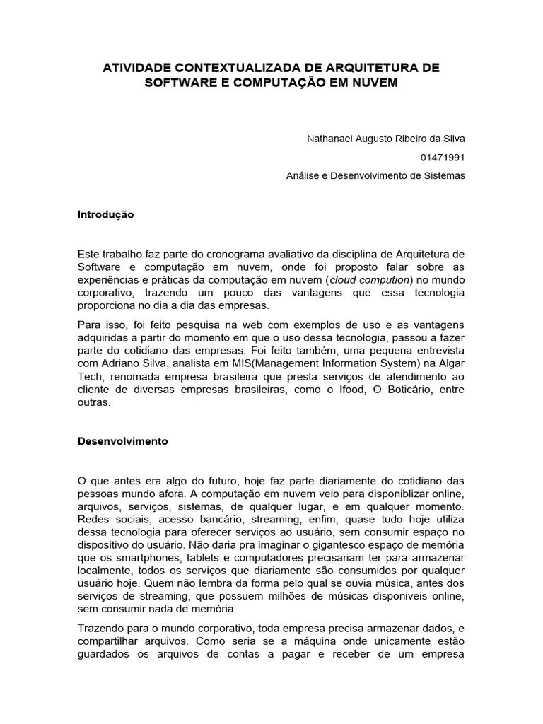 Software e computação em nuvem, onde foi proposto falar sobre as