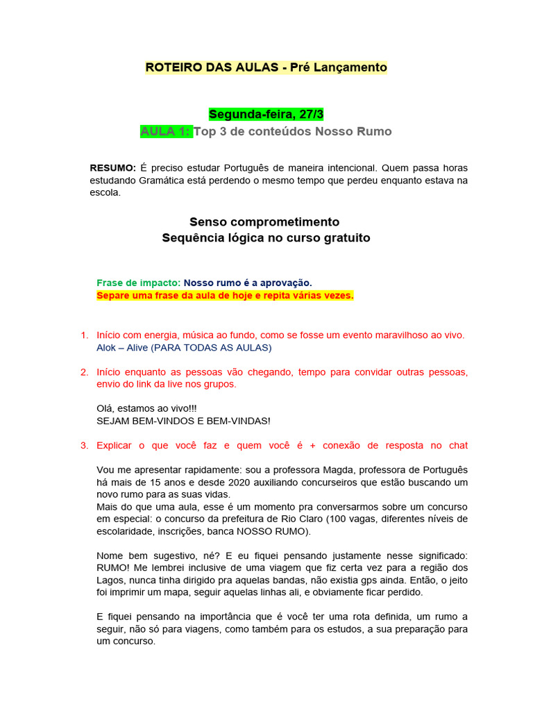 ROTEIRO DAS AULAS - Pré Lançamento