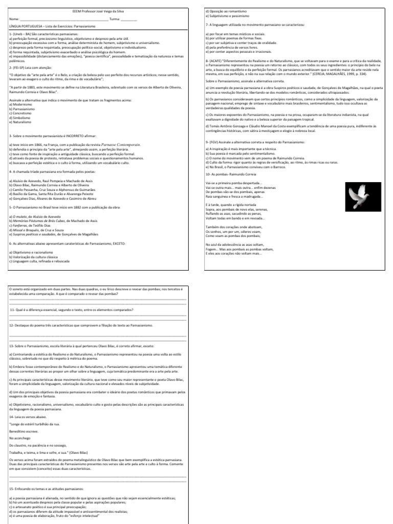 1- (Uneb – BA) São características parnasianas: a) por focar em temas místicos e sociais.