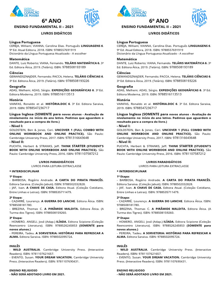- NÃO SERÁ ADOTADO LIVRO EM 2021. - NÃO SERÁ ADOTADO LIVRO EM 2021.