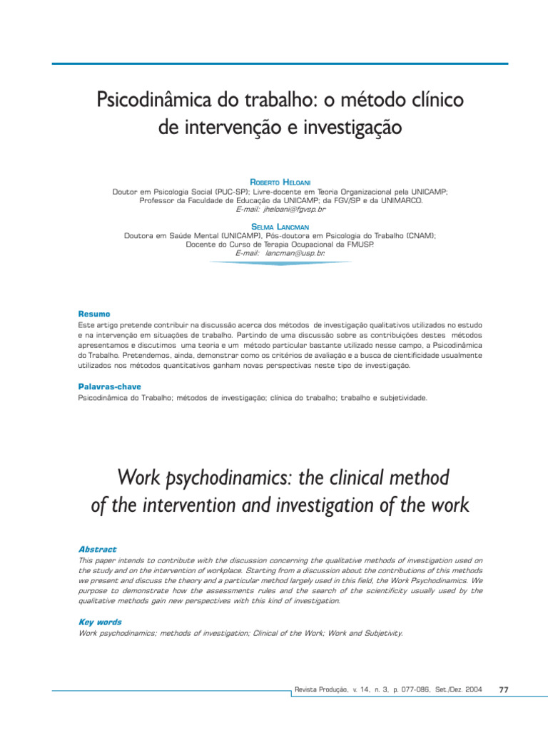 tudo de psicopatologia do trabalho. ministração de Empresas, São Paulo, São Paulo: Rio de Janeiro. Ed. to de Investigaciones Sociales de la