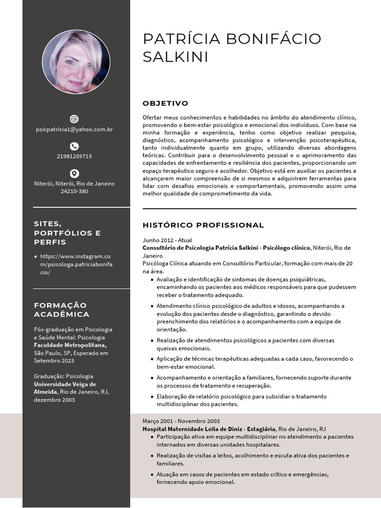 m/[Link] Psicóloga Clínica atuando em Consultório Particular, formação com mais de 20
