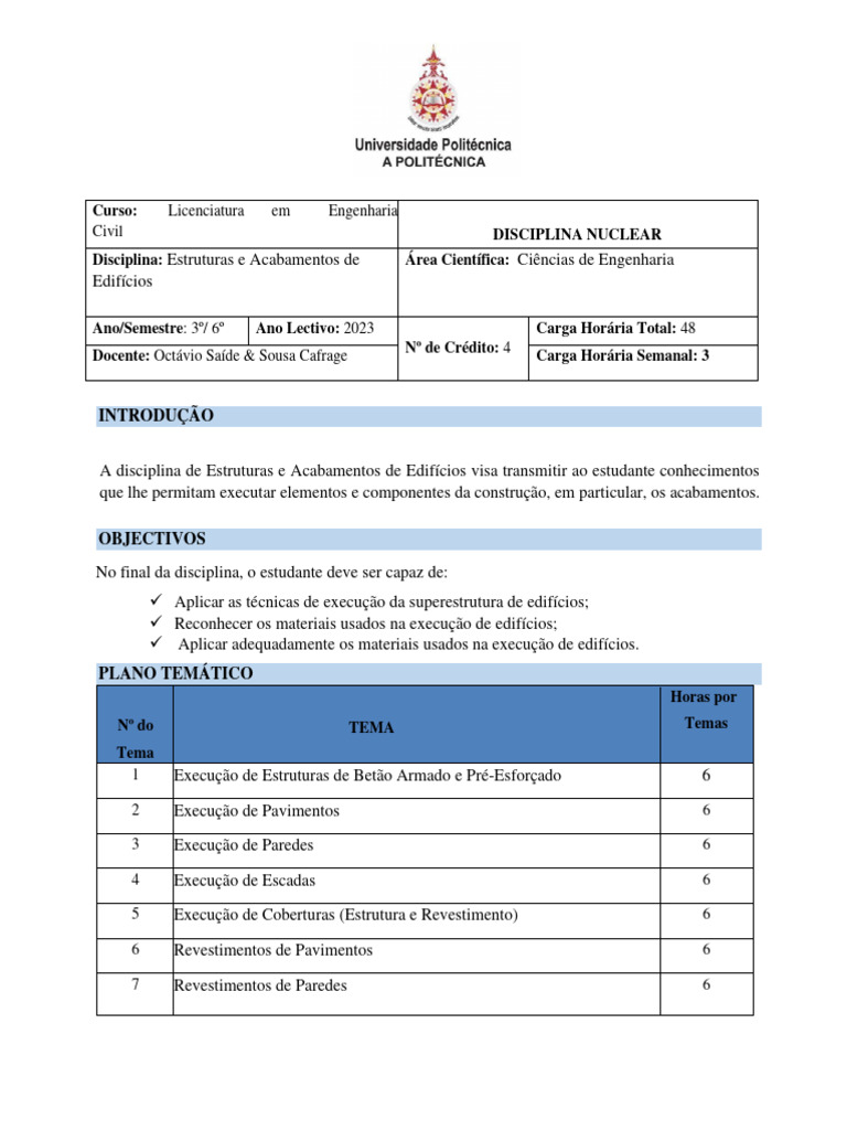 Disciplina: Estruturas e Acabamentos de Área Científica: Ciências de Engenharia