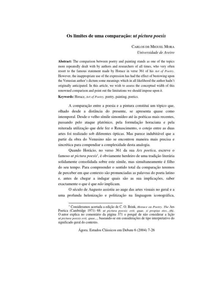 Resumo: A comparao entre a poesia e a pintura ergue-se como um dos tpicos mais utilizados por literatos e investigadores de todos os tempos, que se servem, com muita frequncia, da famosa formulao horaciana do v. 361 da Ars poetica. Porm, o emprego abusivo da expresso tem tido o efeito de atribuir frase do Venusino umas significaes que o autor, provavelmente, no pretendia dar. Neste trabalho propomo-nos avaliar a extenso conceptual da conhecida comparao e as limitaes que lhe devemos impor. Palavras-chave: Horcio, Ars poetica, poesia, pintura, potica. Resumen: La comparacin entre poesa y pintura se alza como uno de los tpicos ms utilizados por literatos e investigadores de todos los tiempos, que emplean a menudo la famosa formulacin horaciana del v. 361 de la Ars poetica. Sin embargo, el uso abusivo de la expresin ha tenido el efecto de atribuir a la frase del Venusino unas significaciones que probablemente no pretenda dar el autor. En este trabajo nos proponemos evaluar la extensin conceptual de la conocida comparacin y las limitaciones que le debemos imponer. Palabras clave: Horacio, Ars poetica, poesa, pintura, potica. Rsum: La comparaison entre la peinture et la posie apparat comme un des topiques les plus utiliss par les crivains et les chercheurs de tous les temps, qui se servent, frquemment de la fameuse formule horatienne du v. 361 de lArs poetica. Toutefois, lutilisation abusive de cette expression a eu pour effet dattribuer certaines significations la phrase de cet habitant de Venouse, sans que celui-ci en ait eu, sans doute, lintention. Dans ce travail, nous nous proposons dvaluer la dimension conceptuelle de la clbre comparaison et les limites qui doivent lui tre imposes. Mots-cl: Horace, Ars potica, posie, peinture, potique.