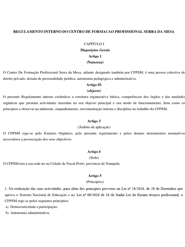 REGULAMENTO INTERNO DO CENTRO DE FORMACAO PROFISSIONAL SERRA DA MESA