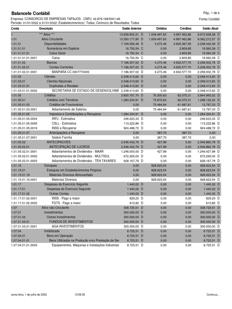 [Link].01 ANTECIPAÇÃO DE LUCROS 2.546.432,79 D 427,99 0,00 2.546.860,78 D
